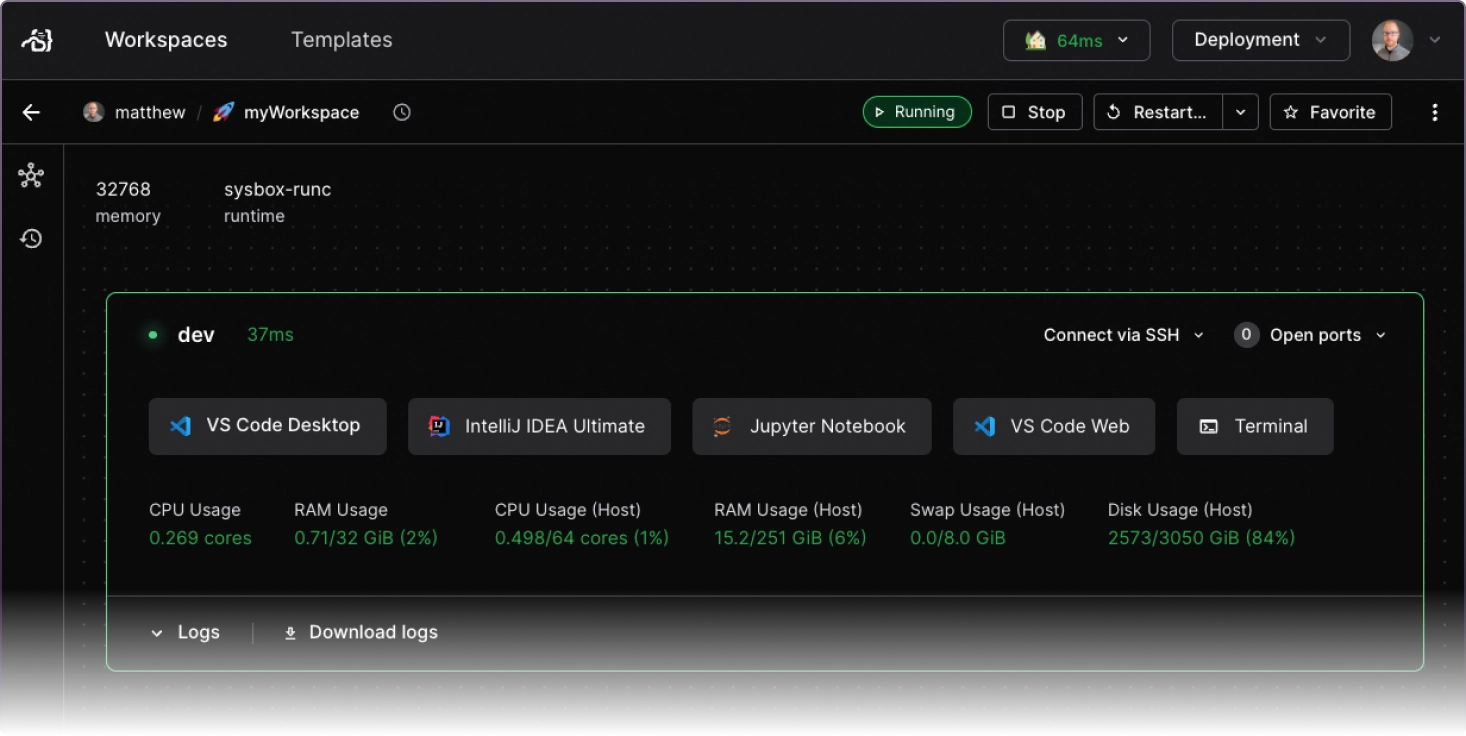 Fully configurable. Define reusable presets for CPU, memory, storage, and Docker volumes so each project spins up with exactly the right specs every time.